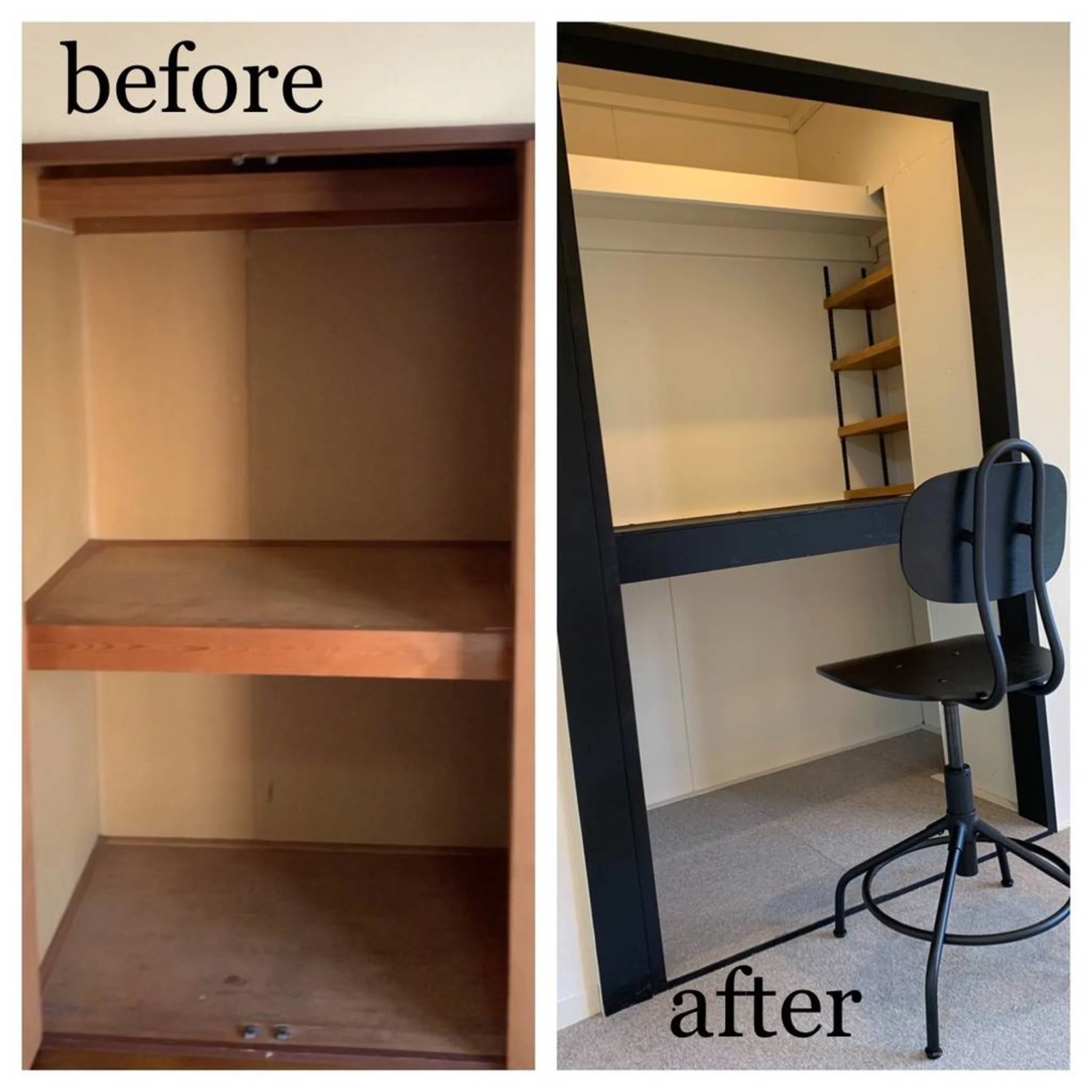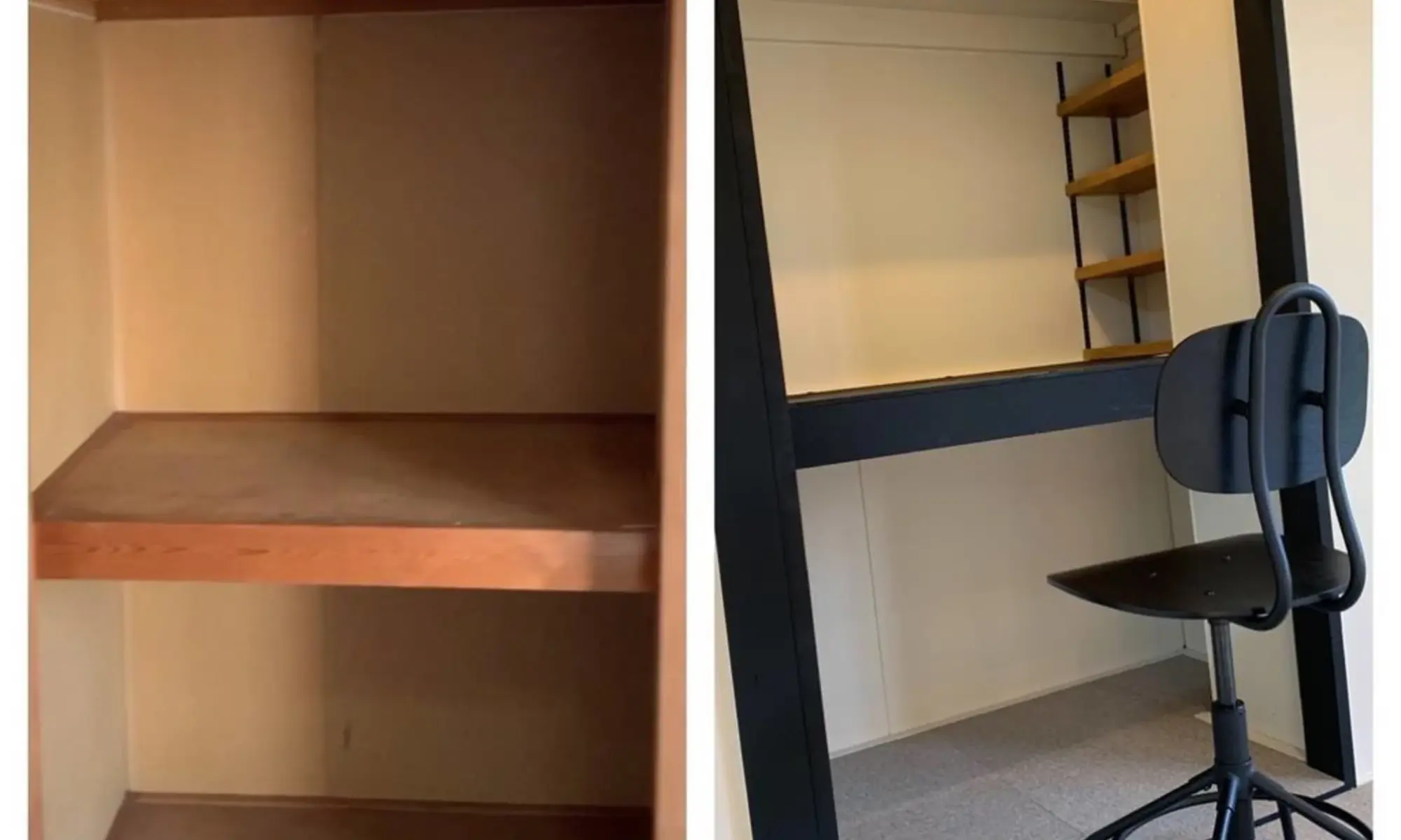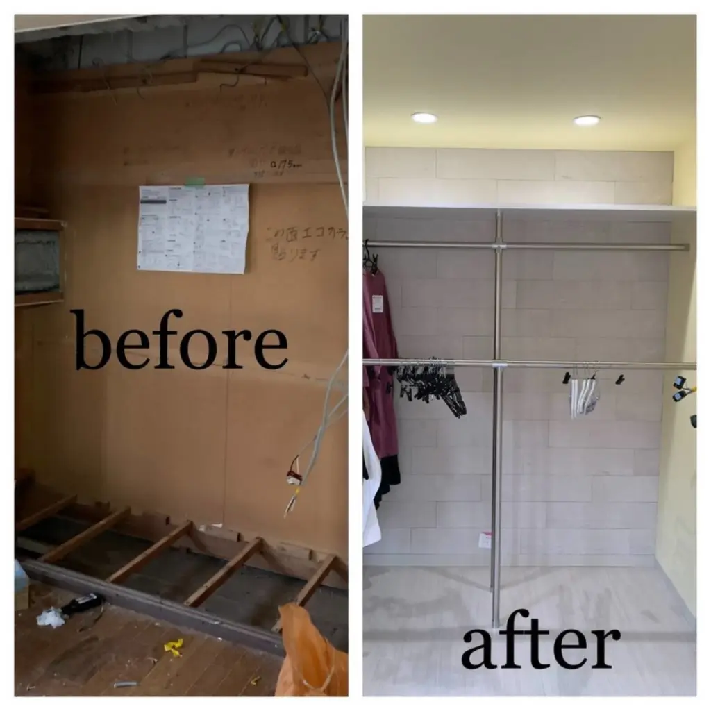 押入れを撤去しハンガーパイプ+棚を設置しダウンライト新設、カビが気になるので換気扇と壁面に調湿、消臭効果のあるエコカラットを貼りました