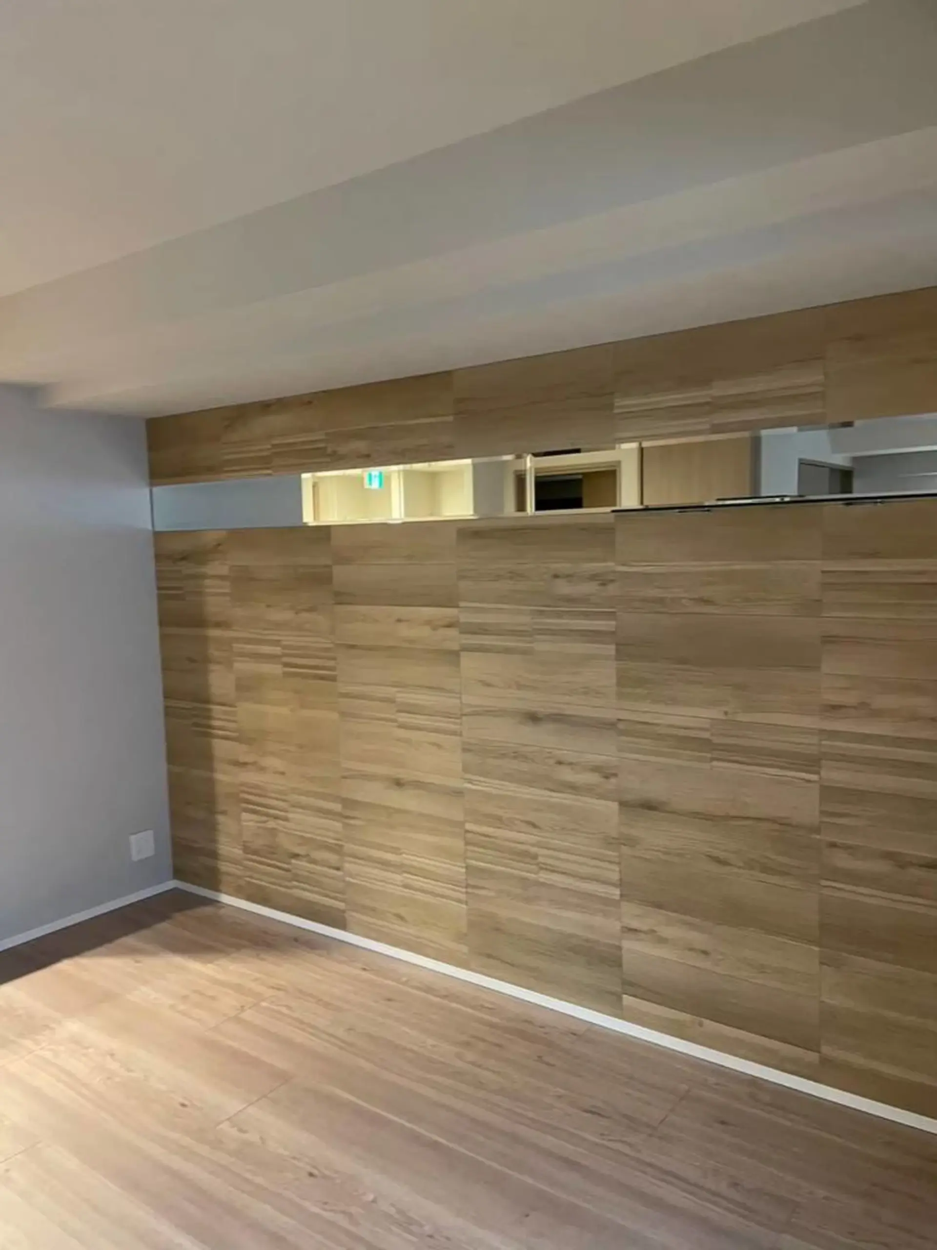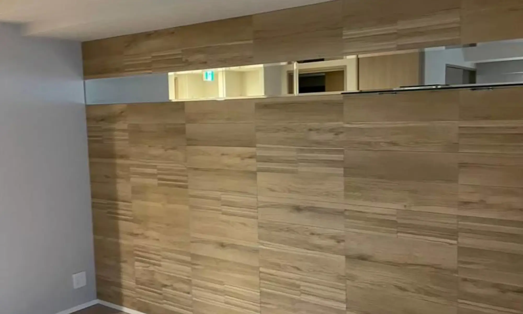 リビングの壁面にエコカラット+ミラー+ガラス棚を設置しました。
